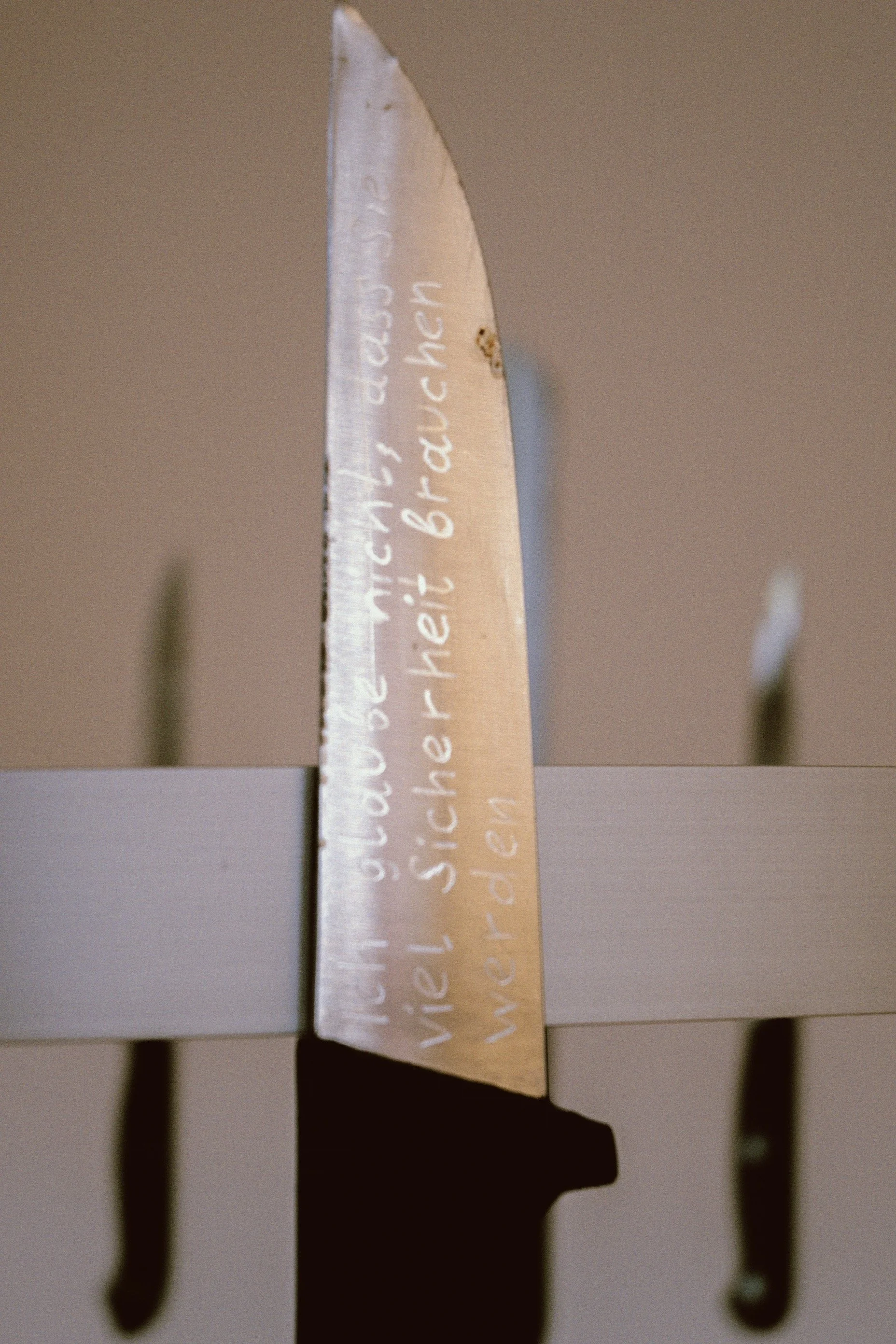 It is a continuation of a series of installations in which I work with speech patterns and recognisable phrases, depending on the context, which are wounding, sharp, or tactless, engraving them on knives. In this edition, I used quotes from a public conversation between Ukrainian President Zelenskyy and US President Trump about the rare earth minerals agreement and the Trump-mediated peace negotiations with russia (28 February 2025).